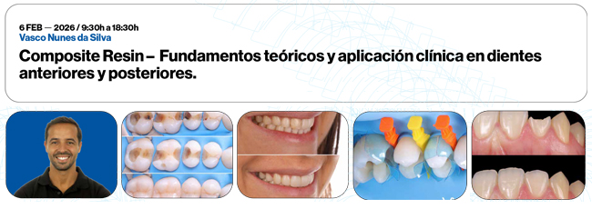 Título del curso: Composite Resin – Fundamentos teóricos y aplicación clínica en dientes anteriores y posteriores. Impartido por: Vasco Nunes da Silva Fecha: 6 de febrero / 2026 Horario: 09:30h a 18:30h Folleto informativo: Descarga el programa completo del Curso Inscripción: Socios GEMO: 0€ No socios GEMO: 299€ → FORMULARIO DE INSCRIPCIÓN Lugar: Hotel Occidental […]